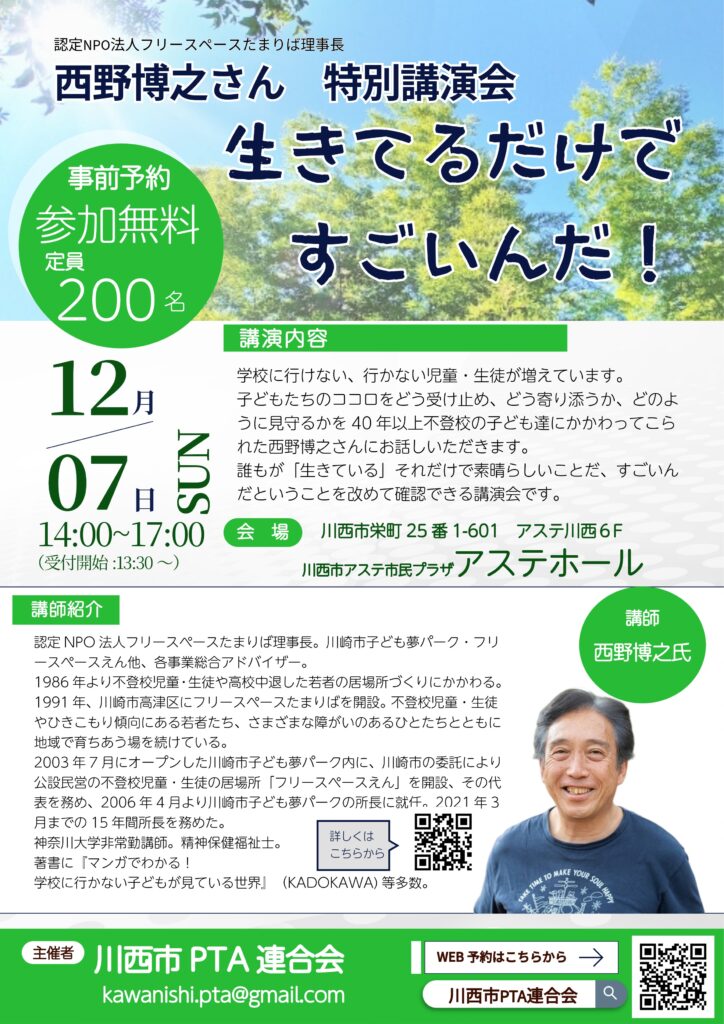 川西市PTA連合会では 認定NPO法人フリースペースたまりば理事長 西野博之氏 の講演会を企画しています。